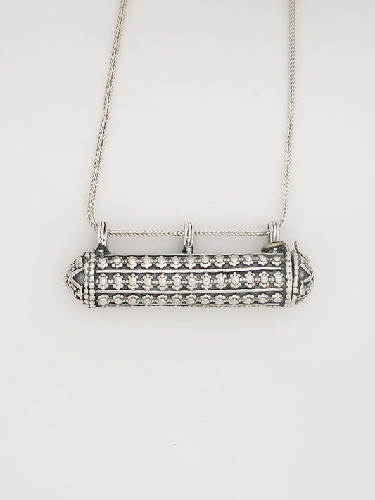 My path in the world of jewelry began by making my authentic silver box pendants for my father’s clients, who ordered special magical talismans from him to write for them. I would make custom sized boxes to fit their specific needs.