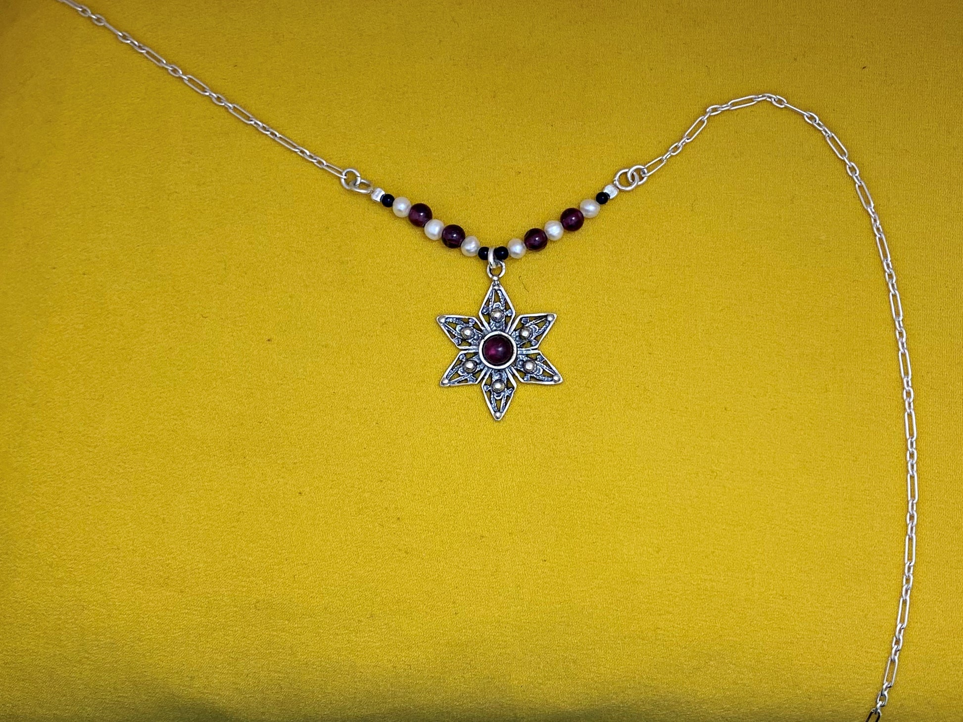 • 925 sterling silver flower pendant with garnet, onyx & pearls