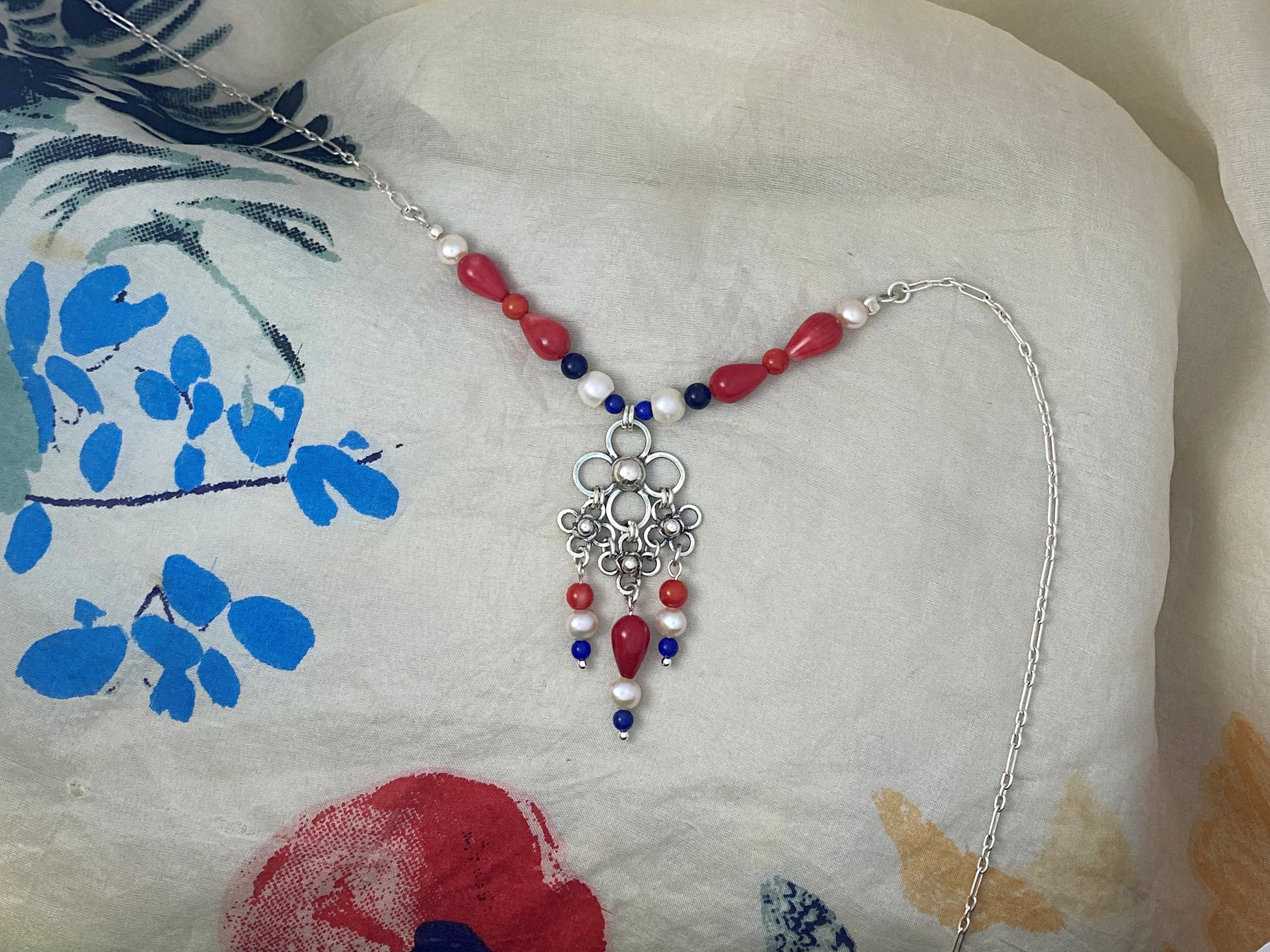 • 925 sterling silver flowers necklace with pearls, lapis, sodalite, carnelian beads